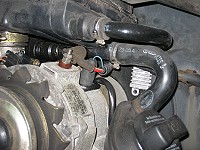 Externen Regler unter dem Schlauch (Aktivkohlefilter - AKF Ventil) in Richtung Gebläsekasten führen. Den Regler mit der beigepackten Schraube (die ist etwas länger als die originale Schraube) vertikal am Gebläsekasten anschrauben. Über diese Schraube und den Kontakt mit dem Gebläsekasten erhält der Regler seinen Masseanschluß. |