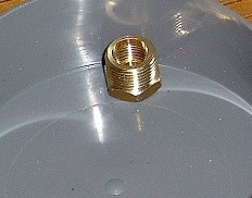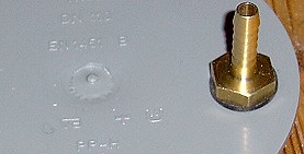 Jetzt werden in die zwei Deckel am Rand je ein Loch mit 12 mm gebohrt. Da ist zwar für ein freies einschieben der Gewindemuffe zu wenig. Aber mit etwas Überredung und einem 17'ner Schlüssel geht da schon. Also Dichtung über die Gewindemuffe und rein damit.