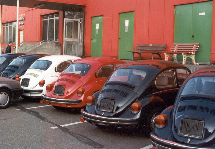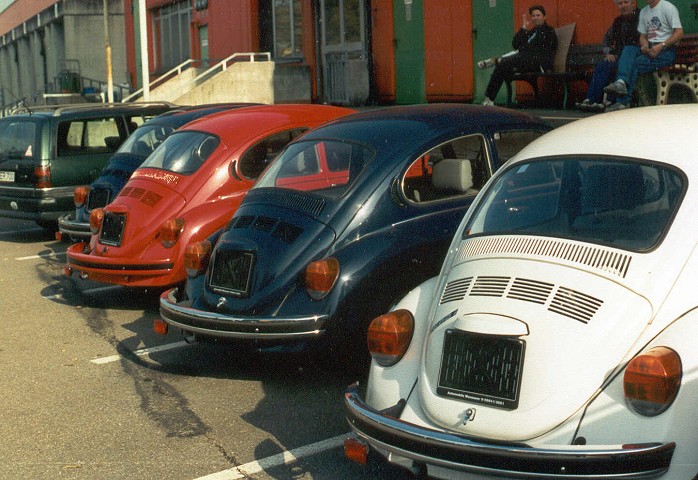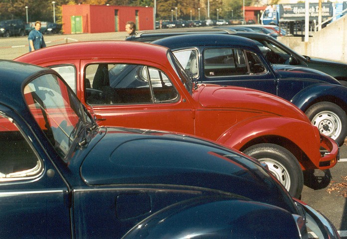 hat mir eine nette Mail mit Bildern geschickt: Anbei ein paar Bilder von den ersten REWE-Käfern am 23.10.1995 vor der REWE-Zentrale in Nussloch bei Heidelberg. Der schöne rote war natürlich schon verkauft, als ich endlich dort war... Aber man konnte ja nachbestellen. Was ich dann auch getan hab. |