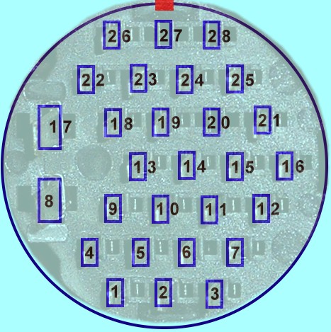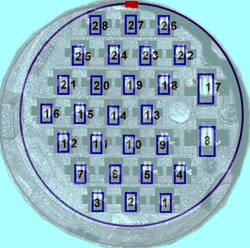 Blick auf dem am Motorgebläse montierten Teil. Dieser hat 26 dünne und 2 breite (8 und 17) Zungen. Im Schaltplan ist dieser Verbinder immer mit T28 angegeben, z.B. T28/1 oder T28/26. Bei den Verbindern bis ca. 1997 sind die Nummern 20, 27 und 28 nicht belegt. Bei den neueren ist mindesten die Nummer 27 mit der Plusverbindung für das Magnetventil (N80) belegt.