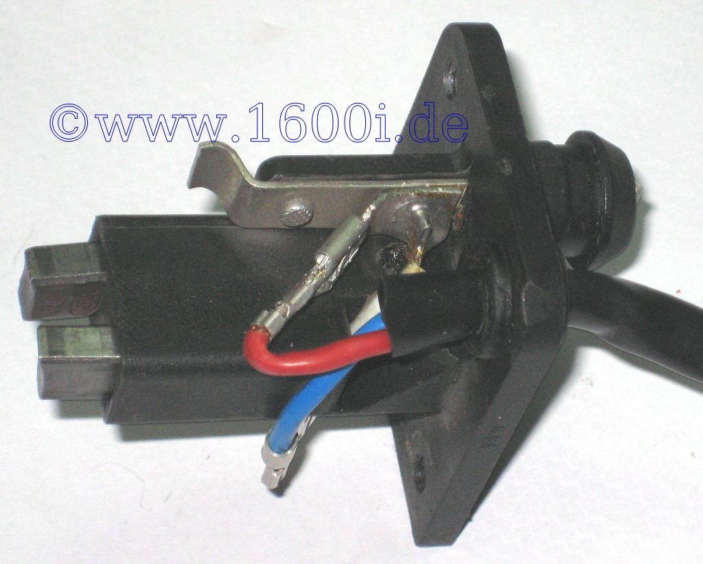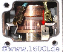 Dazu die "alten" Kabel wenn noch nicht geschehen nach vorne schieben. Dann den Bürtstenhalter in korrekter Ausrichtung (durch die 3 Schrauben vorgegeben) in die Öffnung setzen und etwas Richtung Keilriemen drücken (dieser Widerstand kommt durch die Kontaktfeder, siehe Bild). Die 3 Schlitzschrauben wieder eindrehen |