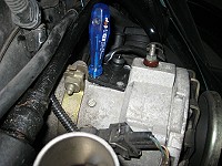 Externen Regler unter dem Schlauch (Aktivkohlefilter - AKF Ventil) in Richtung Gebläsekasten führen. Den Regler mit der beigepackten Schraube (die ist etwas länger als die originale Schraube) vertikal am Gebläsekasten anschrauben. Über diese Schraube und den Kontakt mit dem Gebläsekasten erhält der Regler seinen Masseanschluß. |