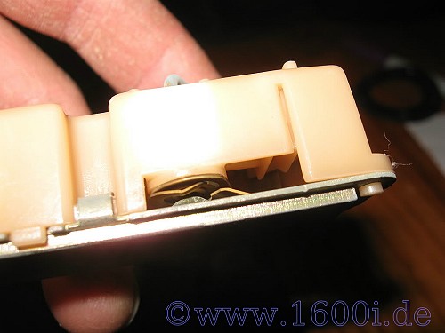 I then very carefully bent the metal tabs securing the plastic rheostat/contact housing part of the fuel gauge sender with a jeweler's flat-bladed screwdriver and a pair of pliers to separate the plastic housing from the rest of the fuel gauge sender. Here's what the fuel gauge looks like inside before I cleaned up it's contacts and rheostat:-