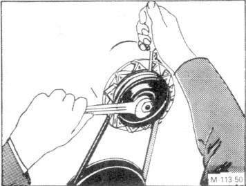 Spezialmutter an der kleinen Riemenscheibe der Lichtmaschine lösen. Beim Lösen und Anziehen dieser Mutter ist die Welle zu blockieren, indem ein Schraubenzieher in die Aussparung der inneren Riemenscheibehälfte geklemmt wird.