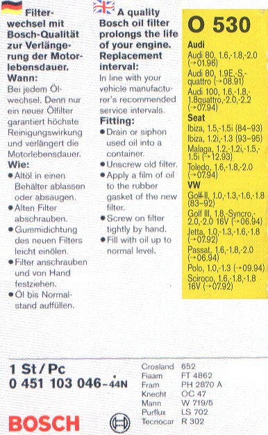 VW-Audi 056 115 561 G, Bosch 0 451 103 033 identisch mit Bosch 0 451 103 046, Crosland 652, Fiaam FT 4862, Fram PH 2870 A, Knecht OC 47, Mann W 719/5, Purflux LS 702, Tecnocar R 302