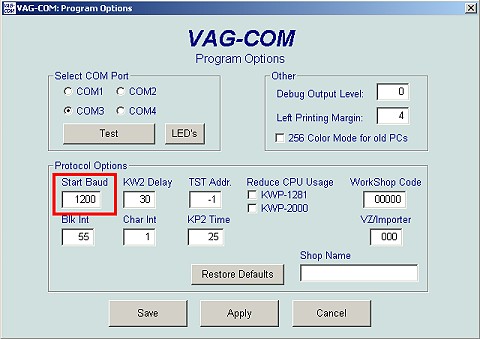 Jeder der VAG-COm verwendet kennt das. Warten, warten, warten....... bis VAG-COM endlich eine Verbindung mit dem Steueregerät des 1600i hergestellt hat. Doch das muss nicht sein. Es geht wesentlich schneller, wenn man unter OPTIONS die Startbaudrate auf 1200 setzt.