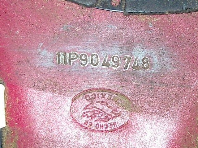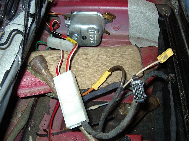 | Und da ist das komische, silbirge Teil. Ein Bosch Spannungsregler für Gleichstromlichtmaschinen. Aber der ist ja nicht angeschlossen. | Ein schöner 34 Ps Vergasermotor, nur gehört er da wirklich nicht hin. Und auf der angeblichen Drosselklappe steht sicher SOLEX, da von denen die Vergaser sind. | Der Fahrzeugschein sagt aber was ganz anderes. Die Fahrgestellnummer ist identisch mit der obigen am Rahmentunnel. | |