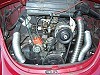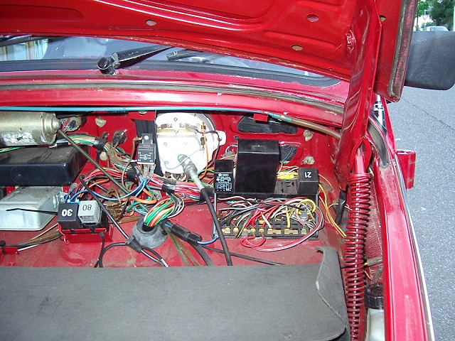 | Ein schönes Rot, ein schöner Käfer | Auch unter der Haube vorn sieht alles in Ordnung aus | Die Fahrgestellnummer sagt, dass es ein 1600i zwischen 1.1.92 und 30.9.93 ist | Aber was bitteschön soll das ? Das Steuergerät hat sich doch in Luft aufgelöst, nur der Halter am Boden ist noch da und kündet von dessen ehemaliger Existenz. |