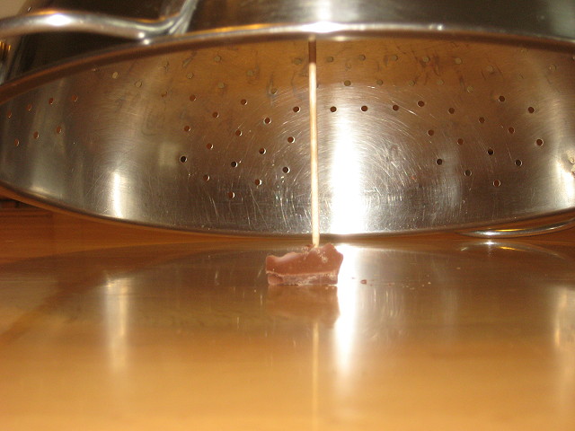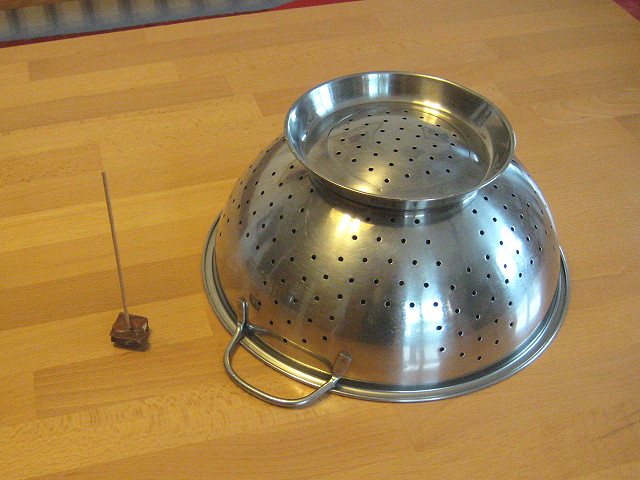 Jetzt geht es darum den Spieß so einzukürzen, das wenn der Spieß einigermaßen senkrecht auf der Schokolade steht und das Sieb absützt, der Spalt unter dem Sieb gerade noch hoch genug ist, um dort mit der Hand ohne Berührung des Siebes hindurchzukommen.