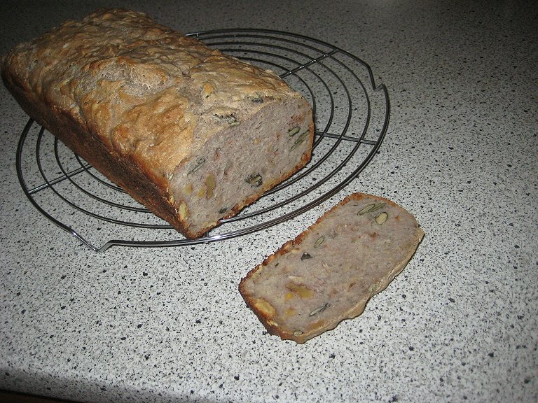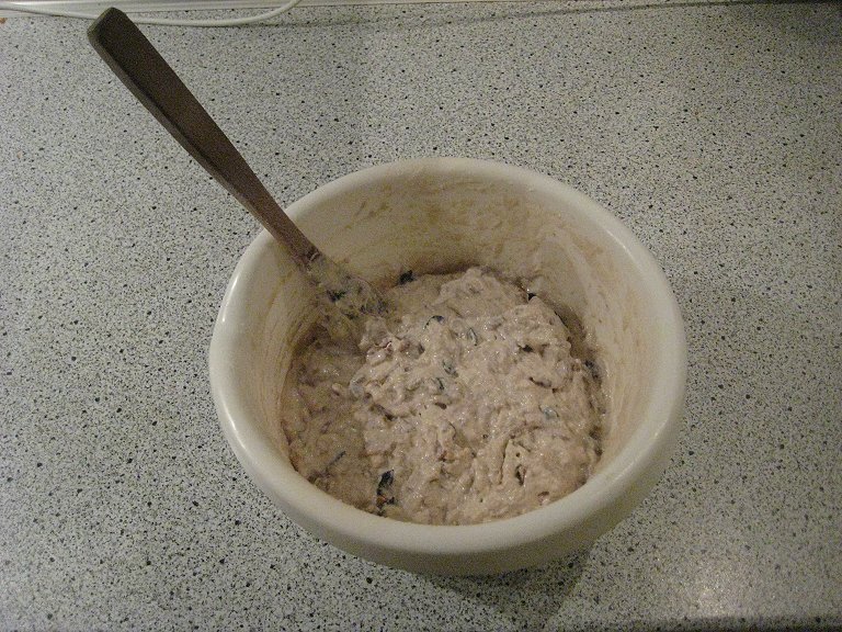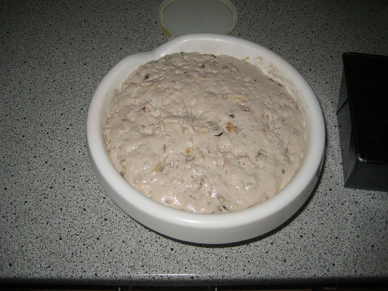 Der fertige Teig, entgegen des Rezeptes füge ich die Nüsse jetzt vor dem Wasser zum Mehl, damit sacken sie nicht ab.