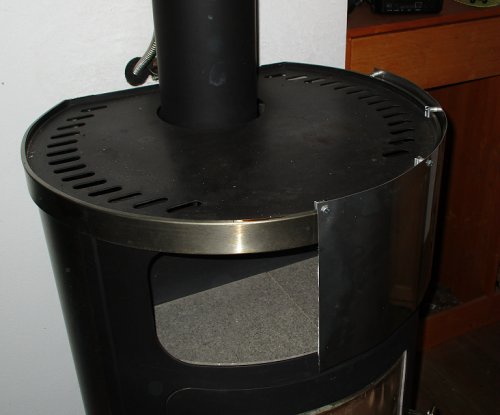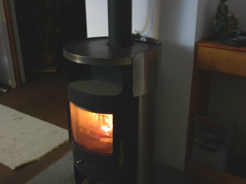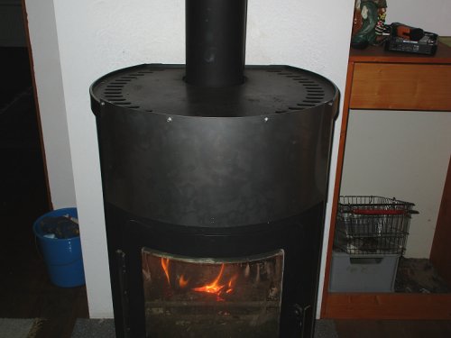Um die Hitze etwas mehr zu nutzen, hab ich vor Jahren auch schon ein wasserführendes Ofenrohr eingebaut. Das reicht in der Heizperiode aus um unseren Warmwasserbedarf zu decken.